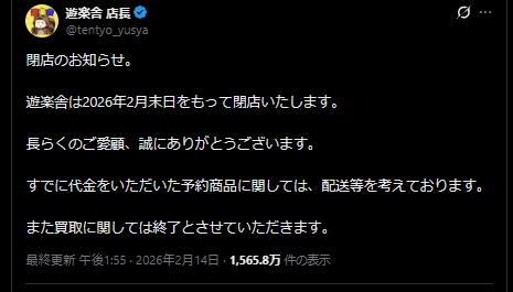 2026年2月14日、日本のトレーディングカードゲーム(TCG)業界のみならず、YouTube視聴者層全体に衝撃が走った。兵庫県姫路市に店舗を構え、大物YouTuberヒカル氏の動画出演で全国的な知名度を誇ったTCG専門店「遊楽舎(ゆうらくしゃ)」が、同月2月末をもって完全閉店することを発表したのである。